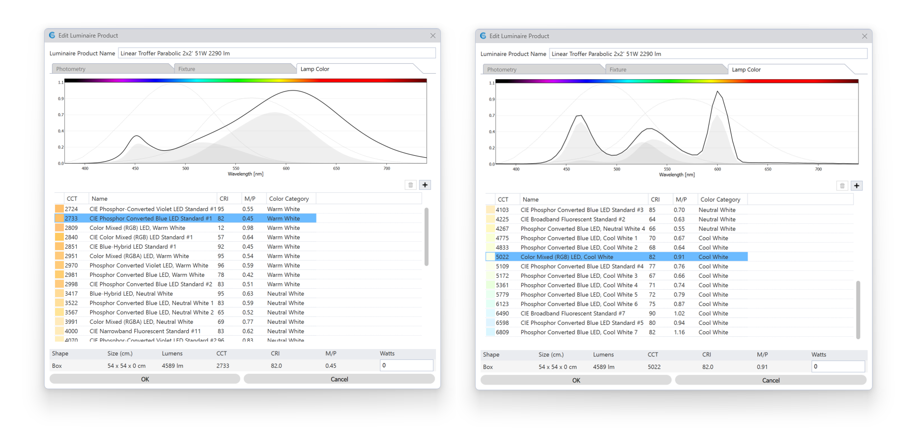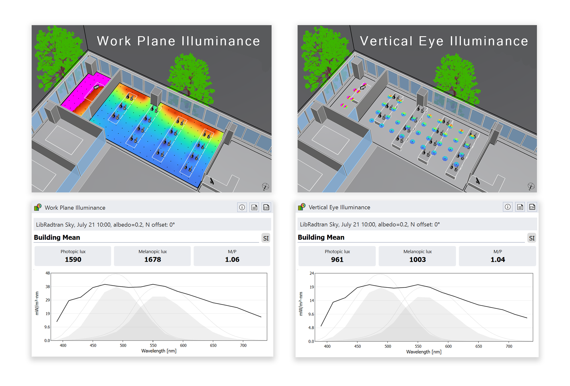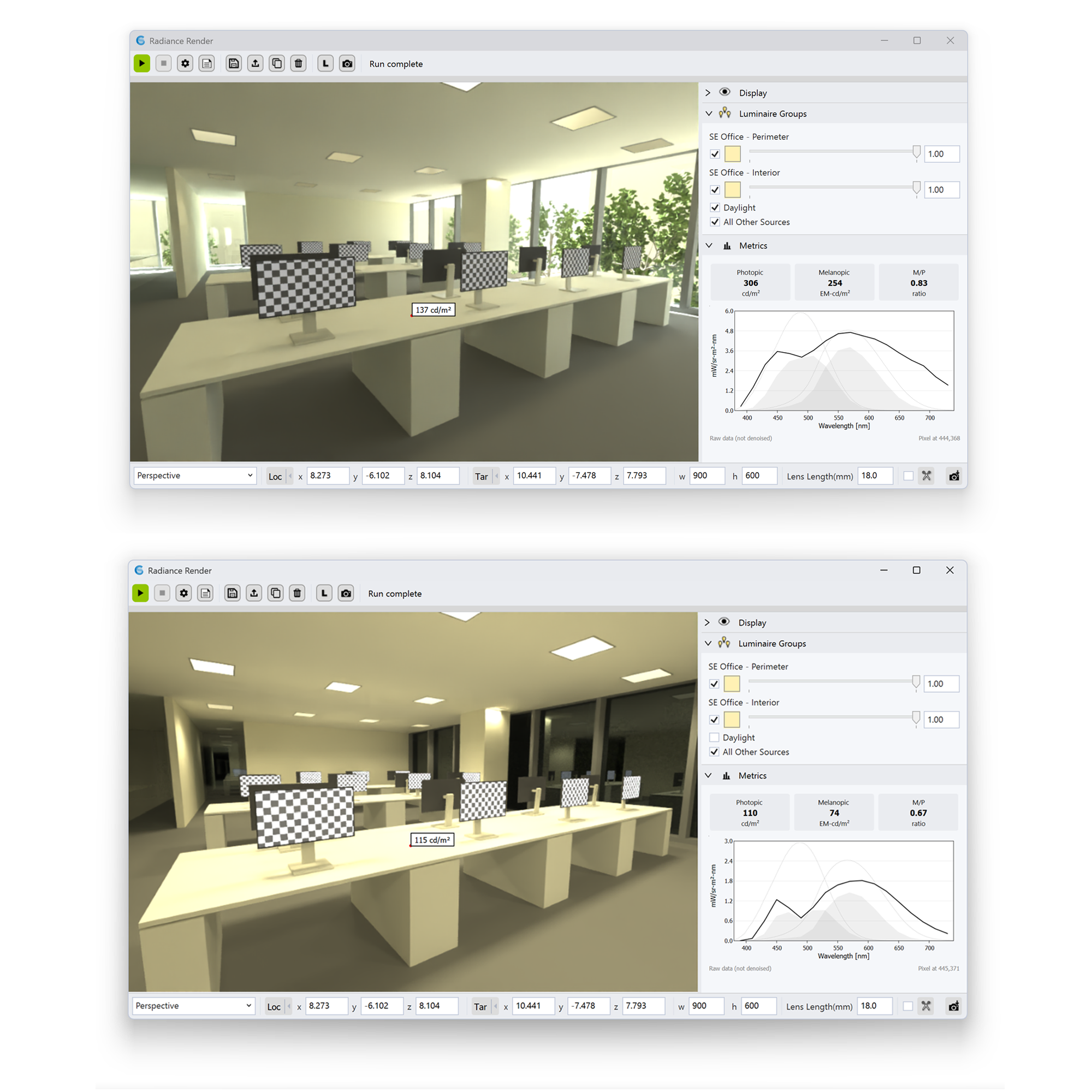The first mode is useful for assessing color rendition on the task plane, while the second is useful for assessing the alerting potential of light arriving at the eye. The new circadian metrics give designers insight into the non-visual impact of their lighting concepts, and aid in the selection of lamp spectra and material finishes that are appropriate for alerting or calming programmatic intents.