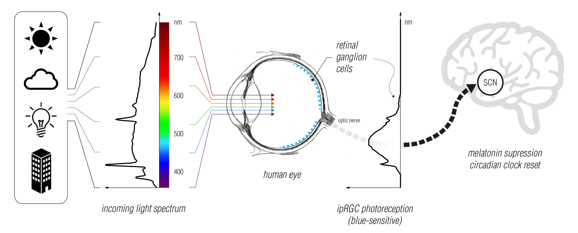 The human eye is not just for seeing. It also contains special photoreceptors (called intrinsically photosensitive retinal ganglion cells, or ipRGCs) that help regulate alertness, sleep, and circadian rhythms. Because these receptors have color responses that differ from those of cone cells, their stimulus cannot be modeled using traditional RGB color rendering. To overcome this limitation, ClimateStudio’s spectral workflows carry out simulations in 20 color channels using Radiance -- a lighting engine developed by Lawrence Berkeley National Laboratory.