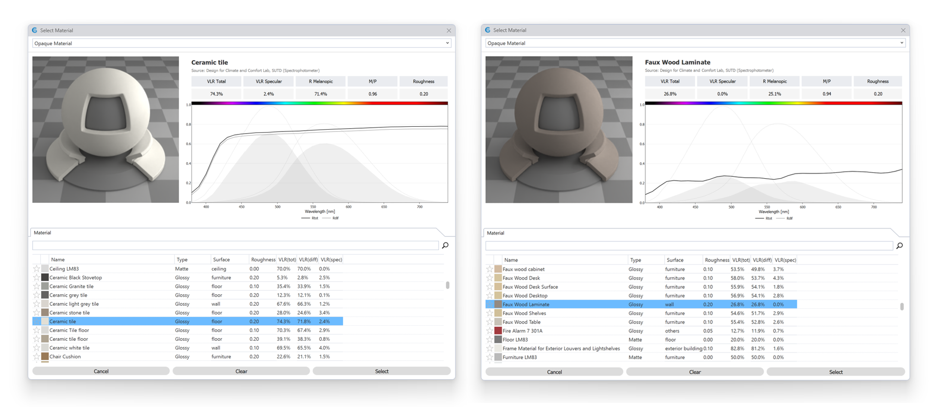 Between emission from a source and arrival at the eye, light spectra are modified by transmission and reflection off material surfaces. To ensure realistic results, ClimateStudio’s material library has been updated to include spectral characterizations of all opaque materials and glazing units, expanding the materials library.