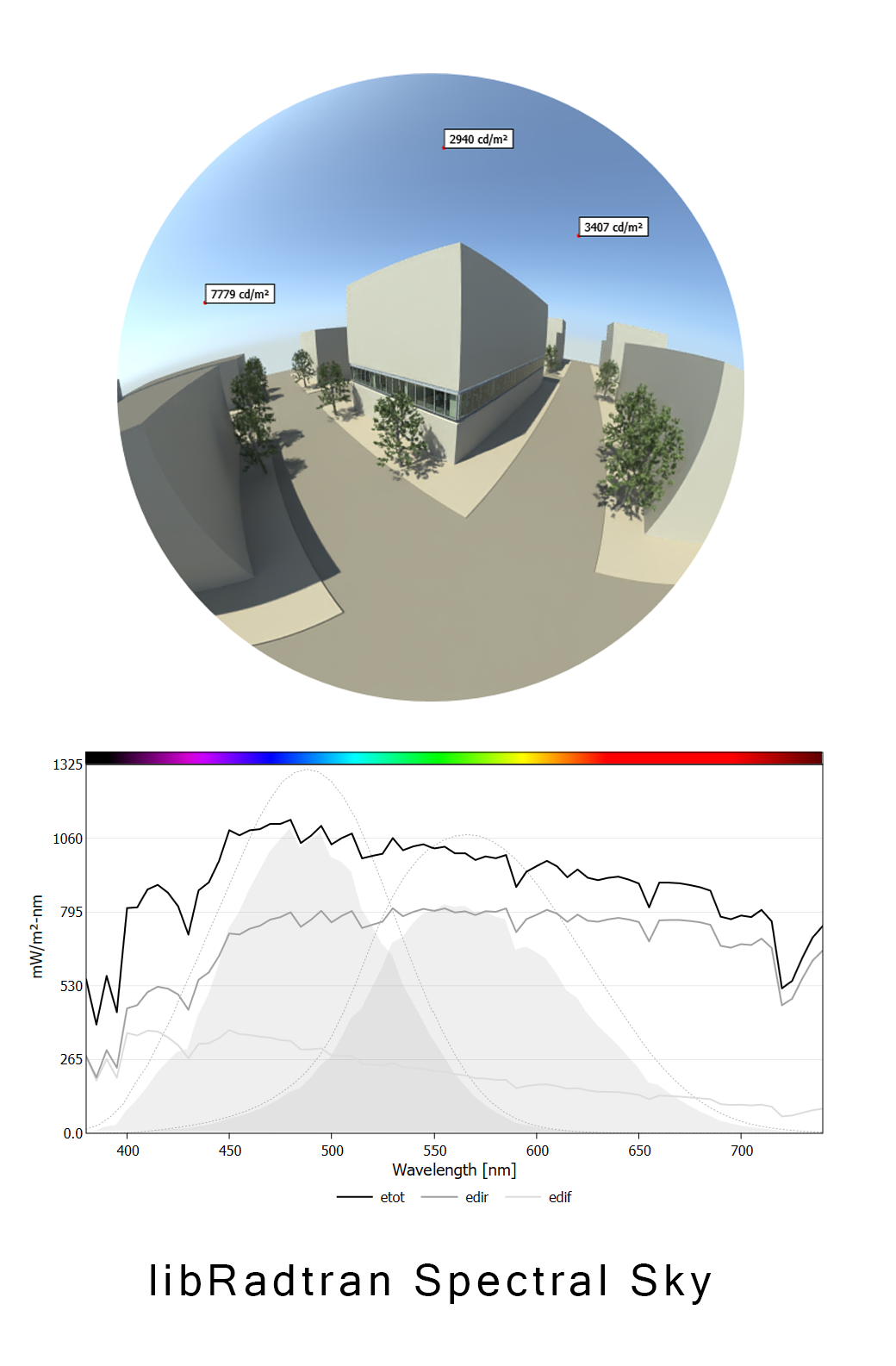 The daytime sky is a powerful driver of circadian biology. Unlike (most) man-made light sources, it varies in color not only by time of day, but also by direction of view. To simulate it accurately, ClimateStudio deploys spectral calculations using the best-in-class radiative transfer library, libRadtran. This lets ClimateStudio users pull up physically-accurate clear, hazy, or overcast skies for any location on Earth.